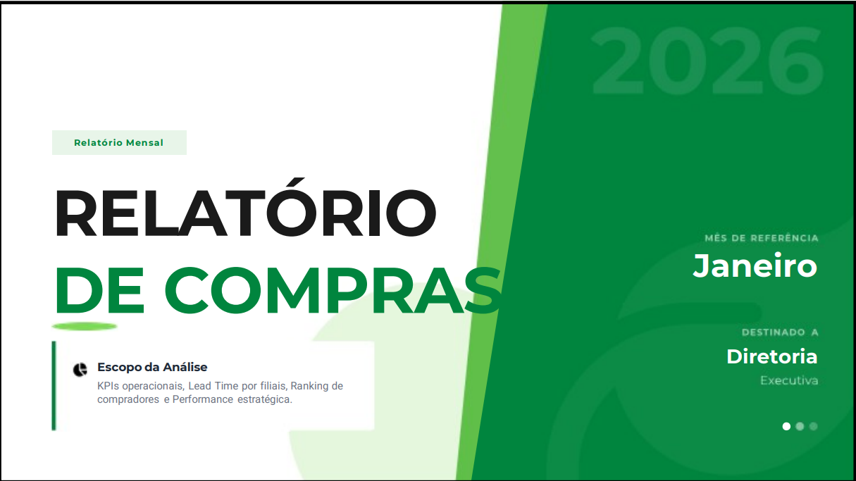 Tenha uma visão executiva da operação de compras. Analise desempenho por filial, ranking de compradores, volume de pedidos e classificação de urgências em um relatório ideal para apresentações gerenciais e reuniões de diretoria.